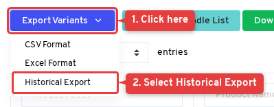 Click the Export Variants button at the top of the page. You will see three options: CSV Format, Excel Format, and Historical Export.