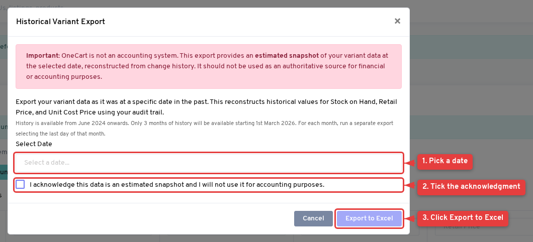 The Historical Export feature lets you download an Excel file of your variant SKU data as it was at a specific date in the past. OneCart reconstructs the data from your change history (audit trail), giving you a snapshot of: