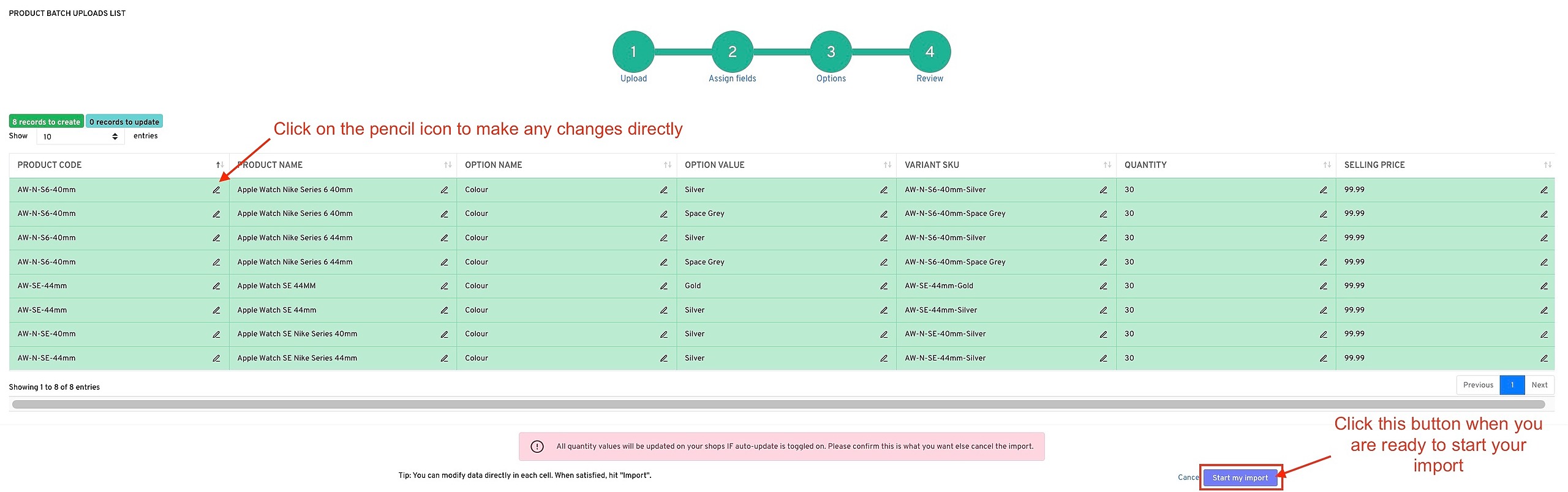 3d) REVIEW - Do take note that all quantity values will be updated on your shops IF auto-update is toggled on. Please confirm this is what you want else cancel the import.