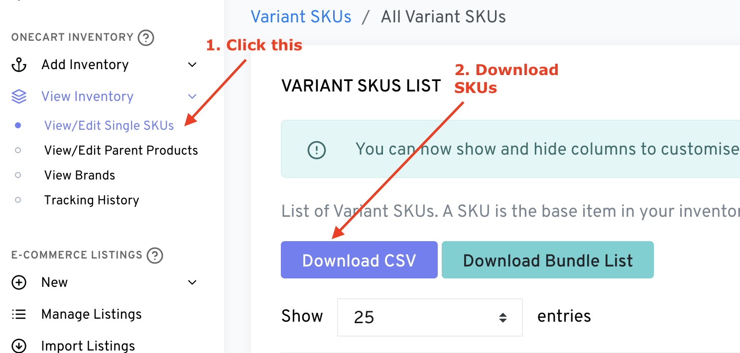 Navigate to OneCart Inventory > View Inventory > View/Edit Single SKUs