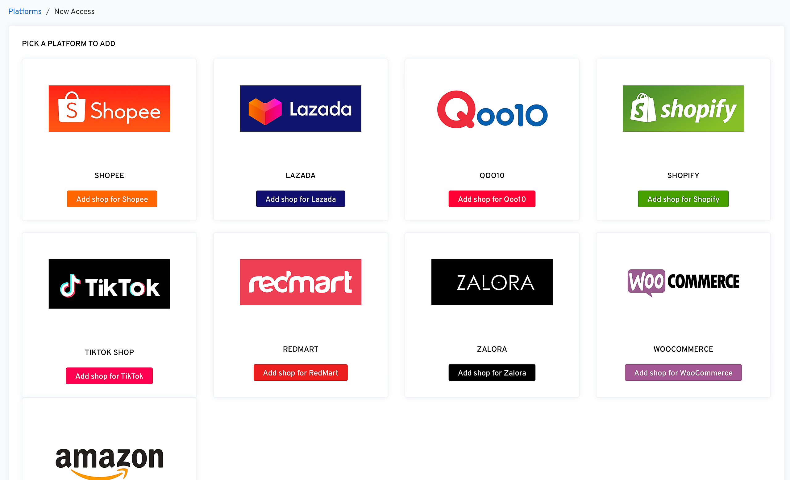 Look for your desired platform you would like to add the shop then follow through the steps for each platform. Alternatively you can use the links below to learn how to add shops for different platform.