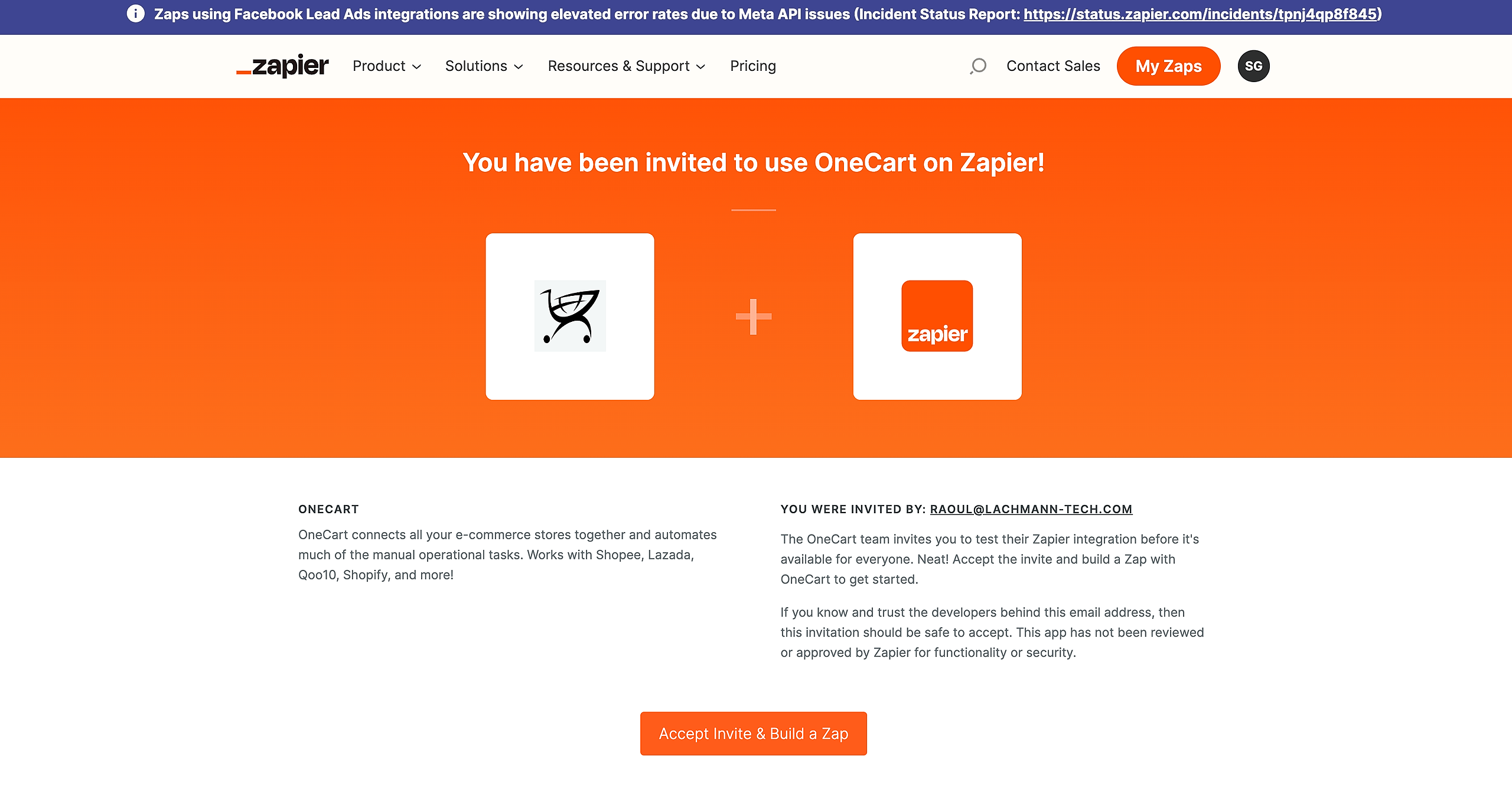 Step 2: Use the link to be invited to use OneCart in your Zapier account