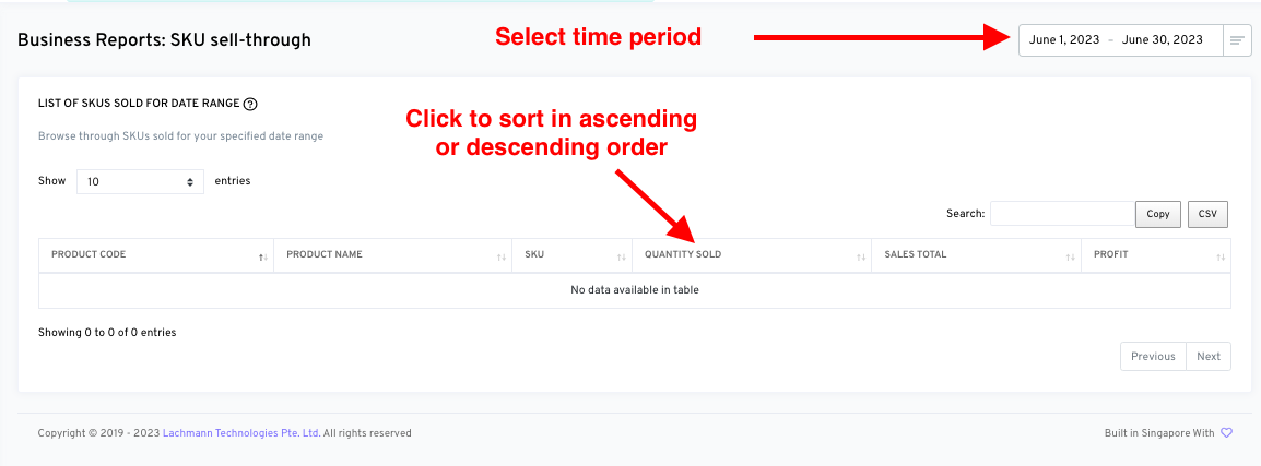 To view your top selling SKUs, you can sort the Quantity Sold column from highest to lowest numbers (and vice versa, to find your slow moving items).