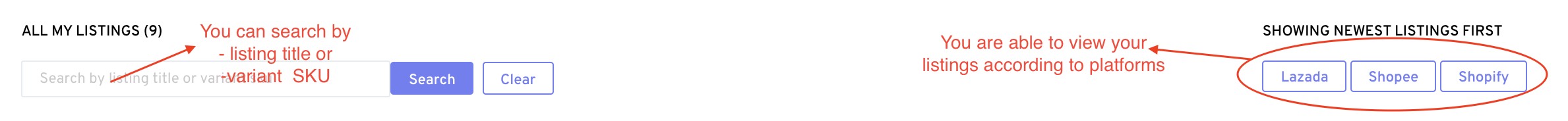 Go to the sidebar Listings > Manage Listings , at the top of the page you are able to choose how you would like to browse your listings. Either by searching for the listing title, variant SKU or platforms.