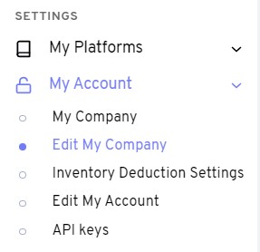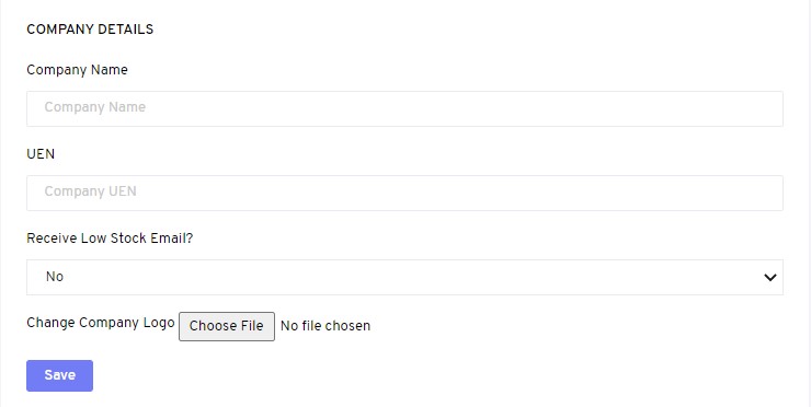 From here, you are able to update your company details and upload company logo and toggling on or off for low stock email notifications.