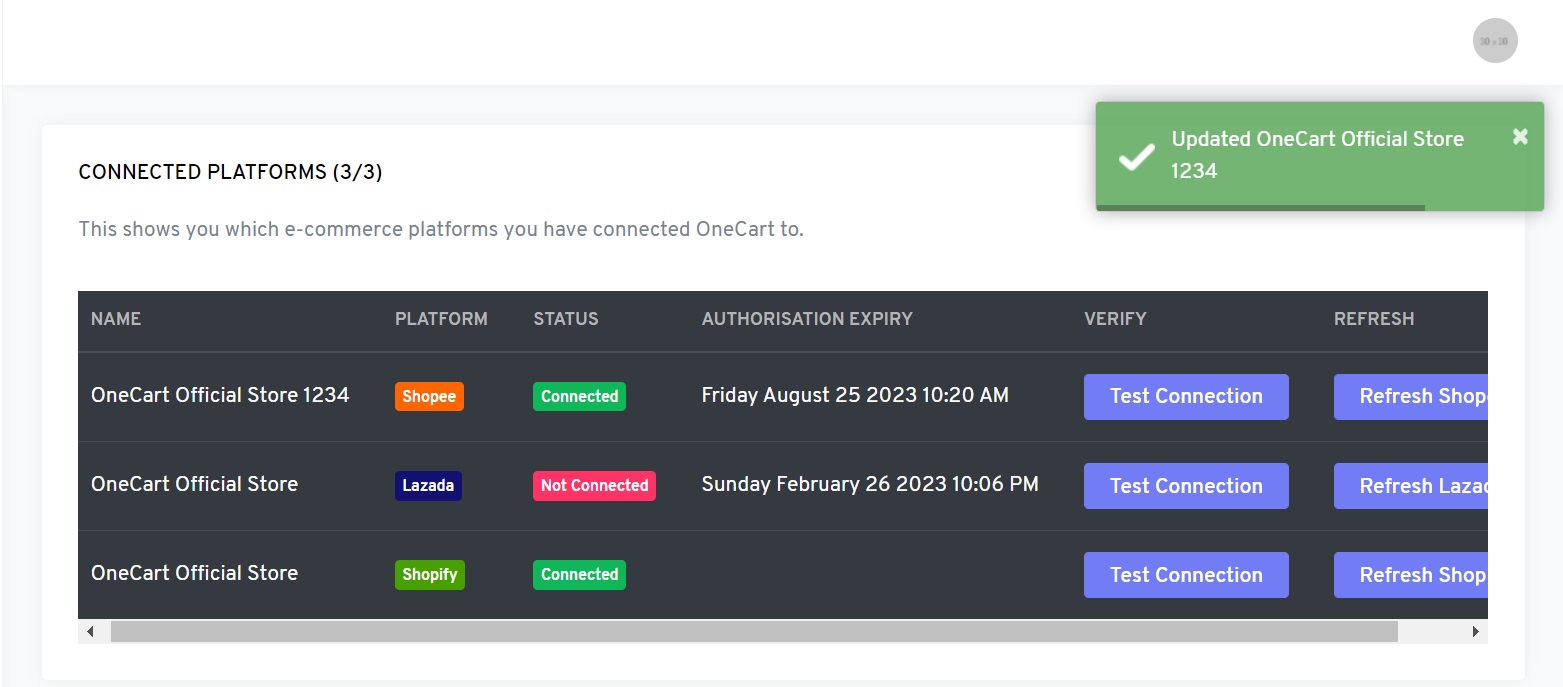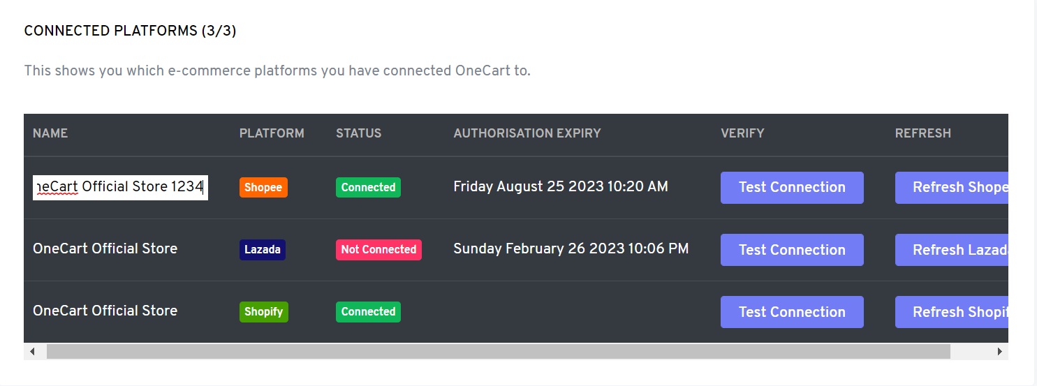 And there we have it! It is important to note that editing the names of your connected platforms in OneCart will not affect the names of your existing stores in the respective marketplaces.