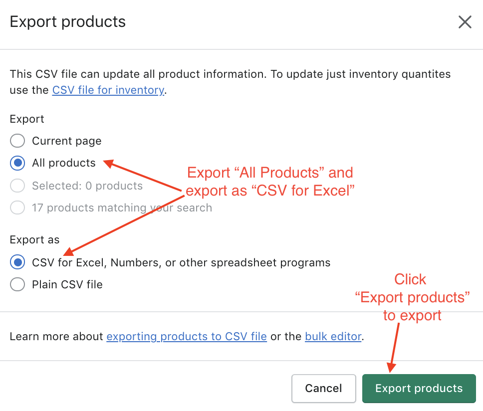 Ensure to select “All Products” and “CSV for Excel, Numbers, or other spreadsheet programs”.