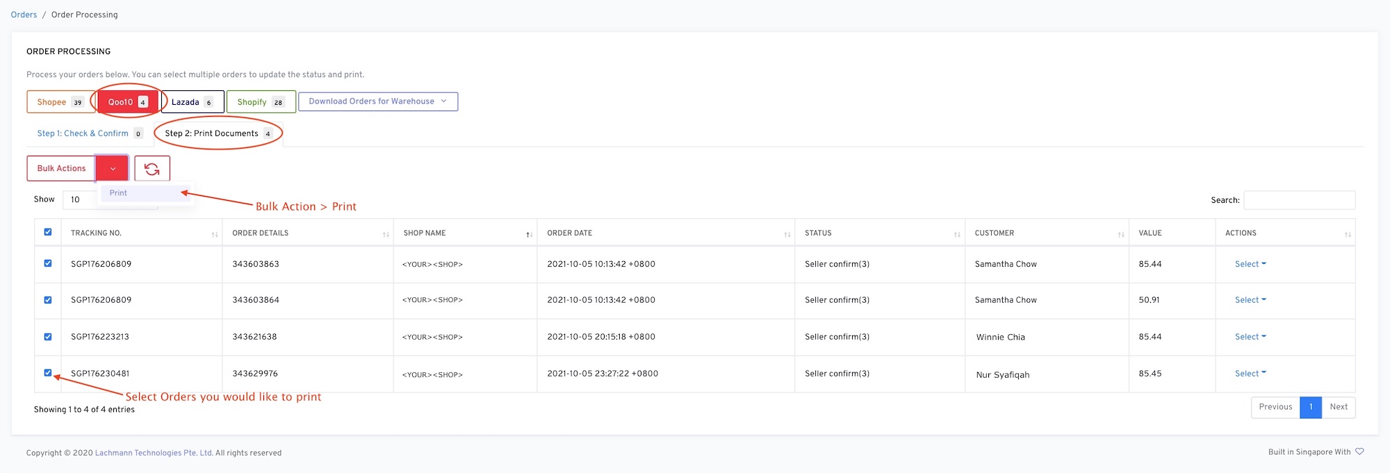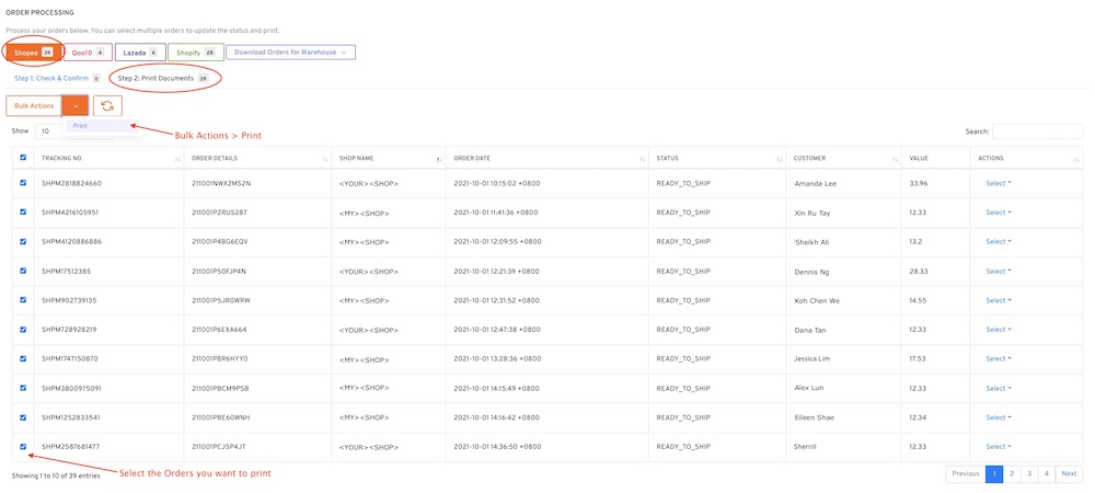 Step 4: Go to Bulk Actions > Set as Packed & Print Shipping