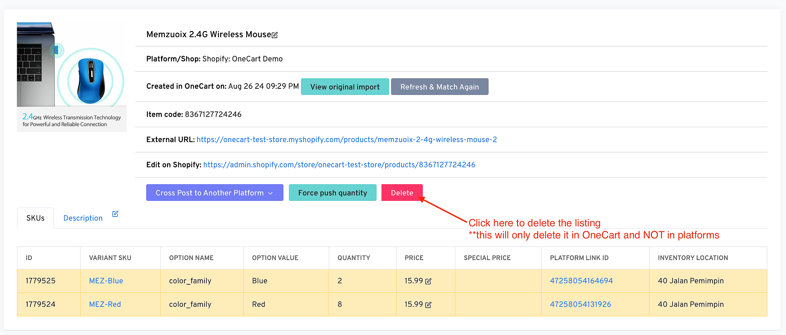 - Delete the listing in OneCart by clicking the ‘Delete’ button