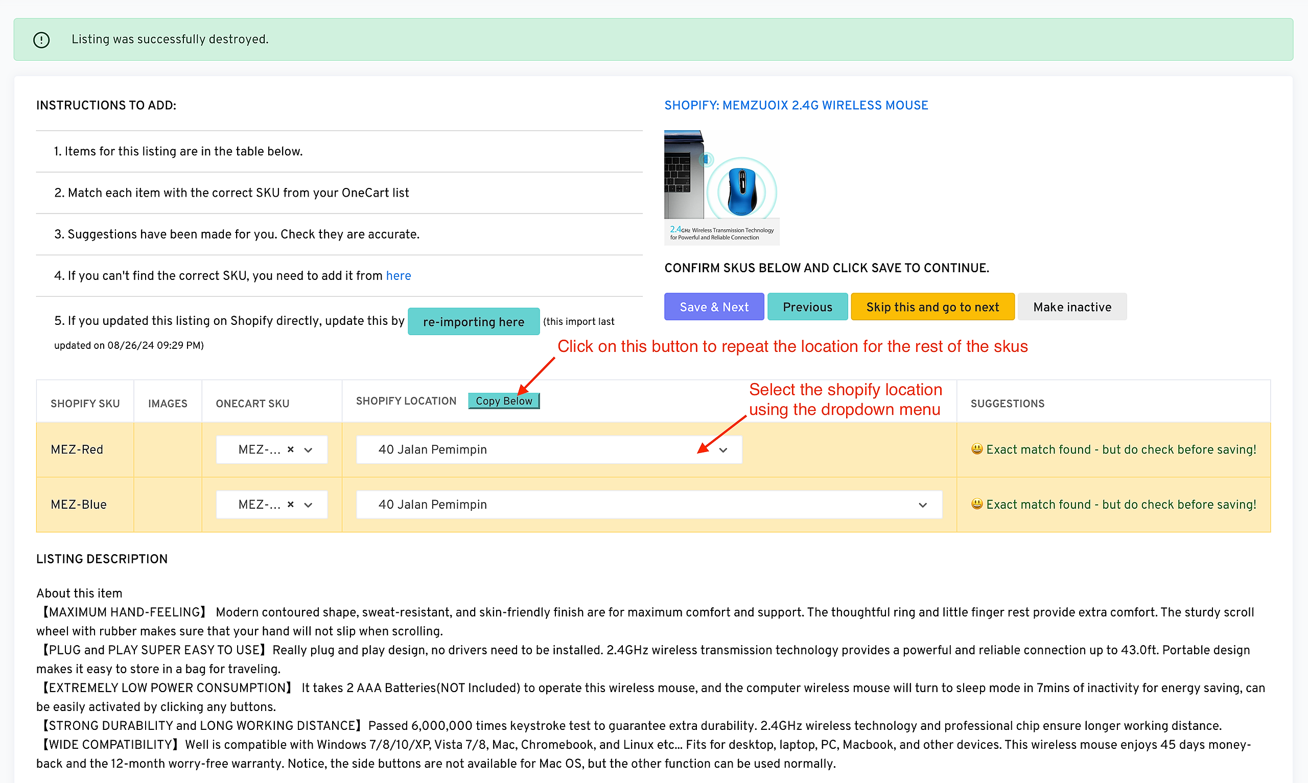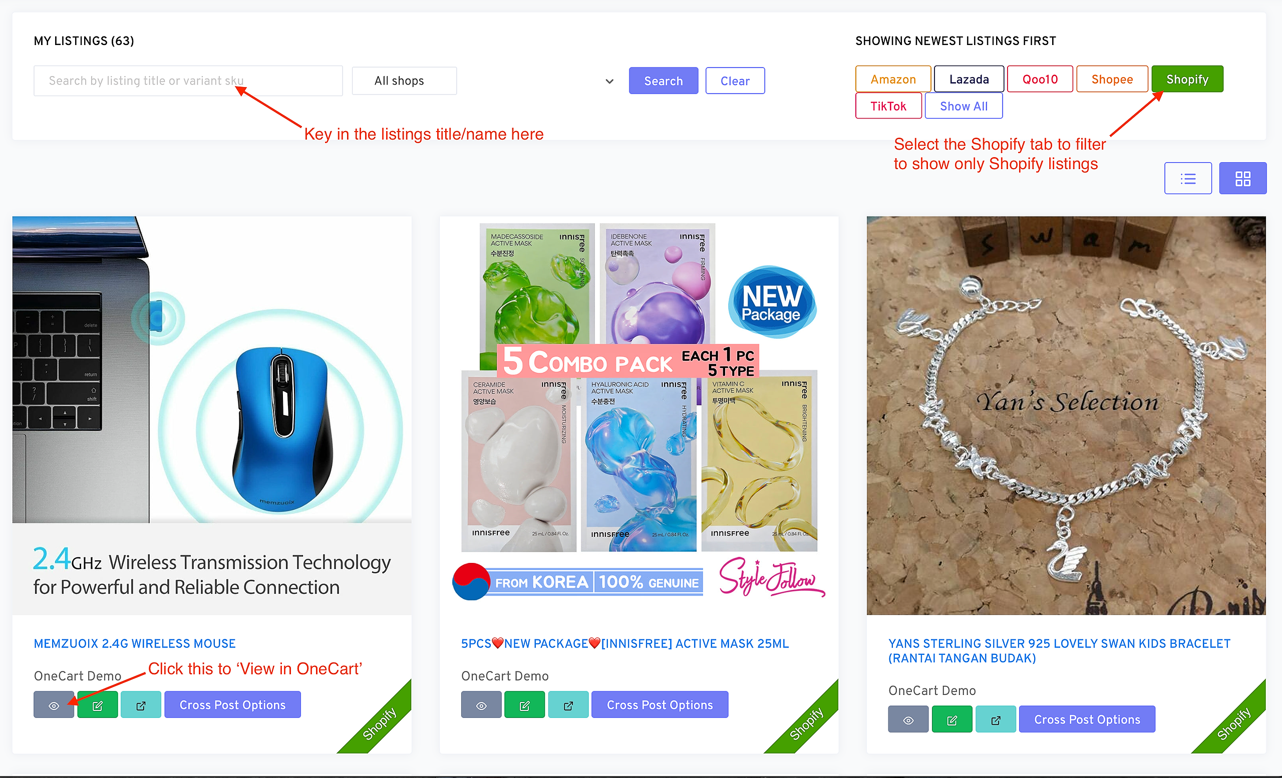 - Check your inventory in OneCart to confirm that it matches the selected Shopify location by going to Manage Listings.