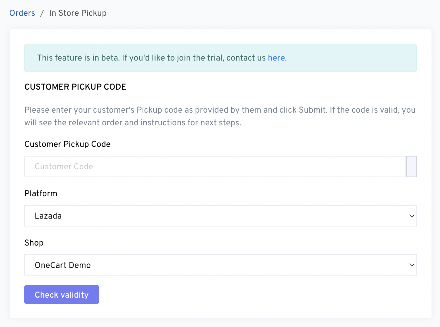 The In-Store Pickup feature in OneCart enables customers to collect their orders directly from your physical store. This feature is currently in beta, and businesses interested in participating can contact us to join the trial.