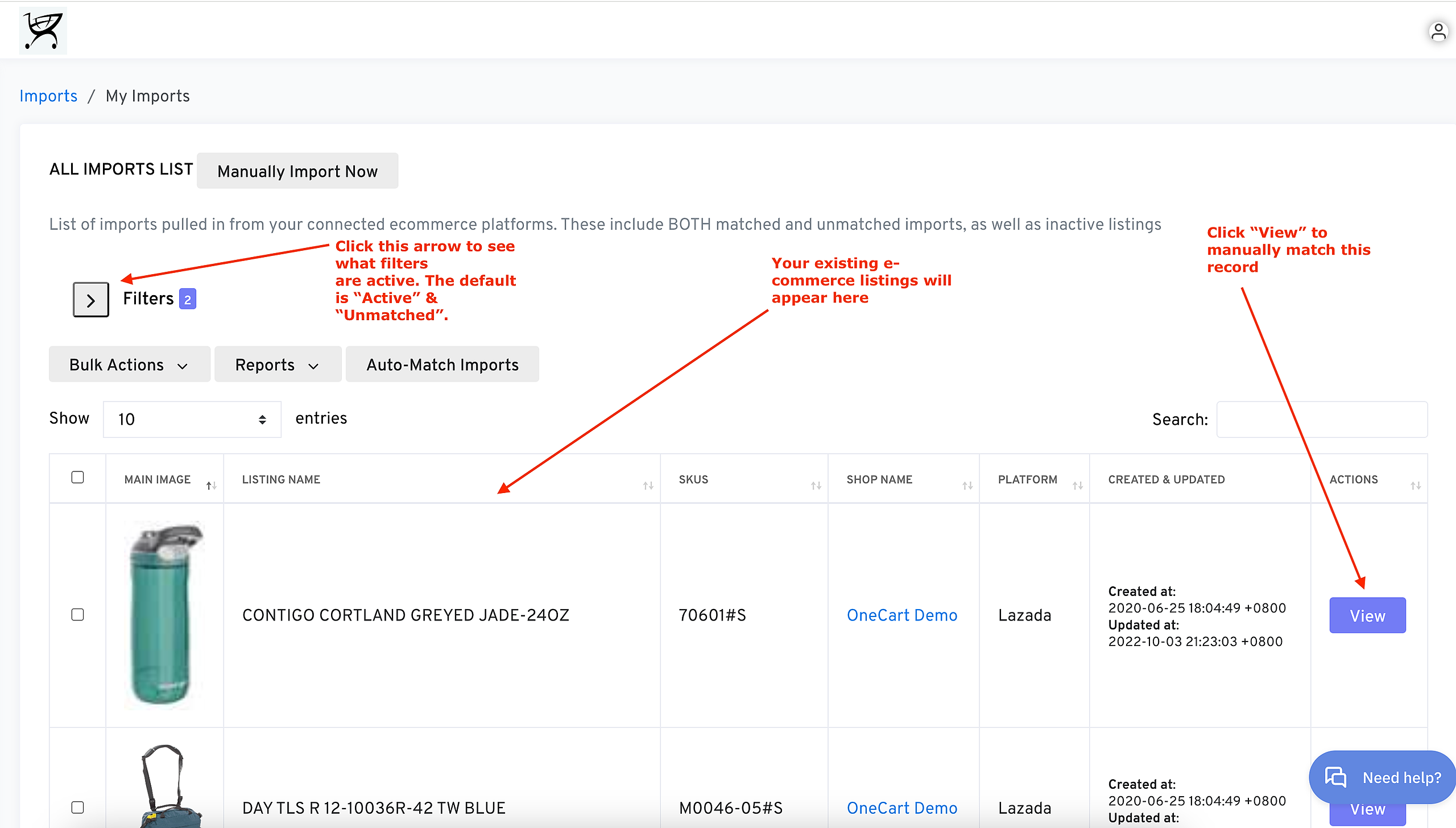 This is where the listings you already have on your e-commerce platforms will show up in OneCart. The default view is to show you “Active” listings which are “Unmatched” in OneCart.