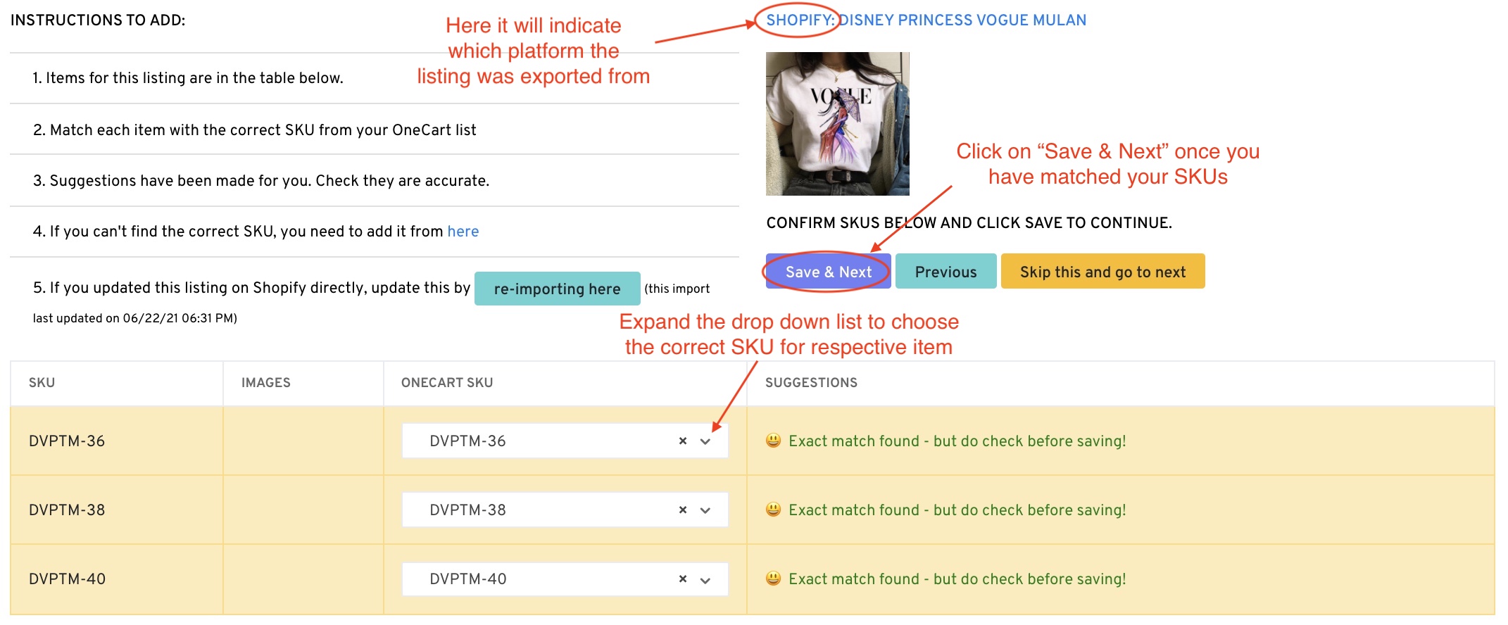 In this step, we will tell OneCart which OneCart SKU should be matched to your platform SKUs.