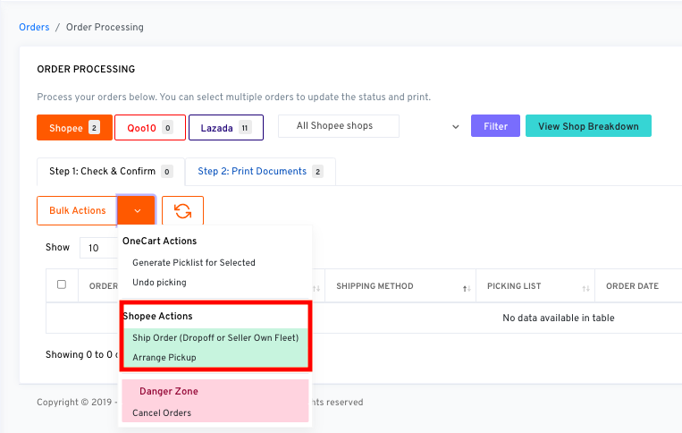 Click on Bulk Actions > Arrange Pickup (for Shopee) or ‘Set as Ready To Ship’ (for Lazada) or ‘Arrange Pickup/Dropoff’ (for Qoo10)
