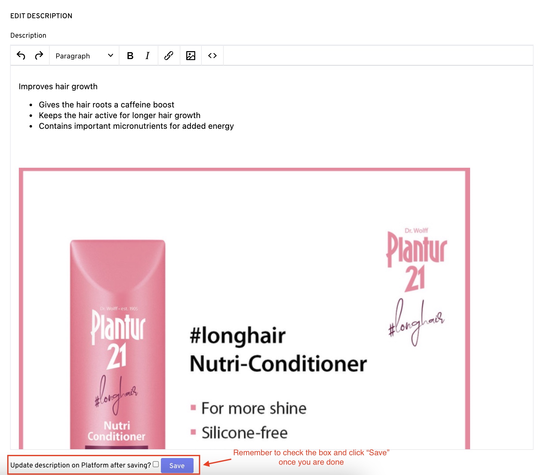 - This will bring you to the “Edit Description” page. Once you are done editing the description, remember to check on the ‘Update description on Platform after saving” box and click save.