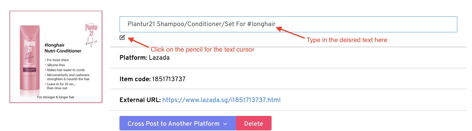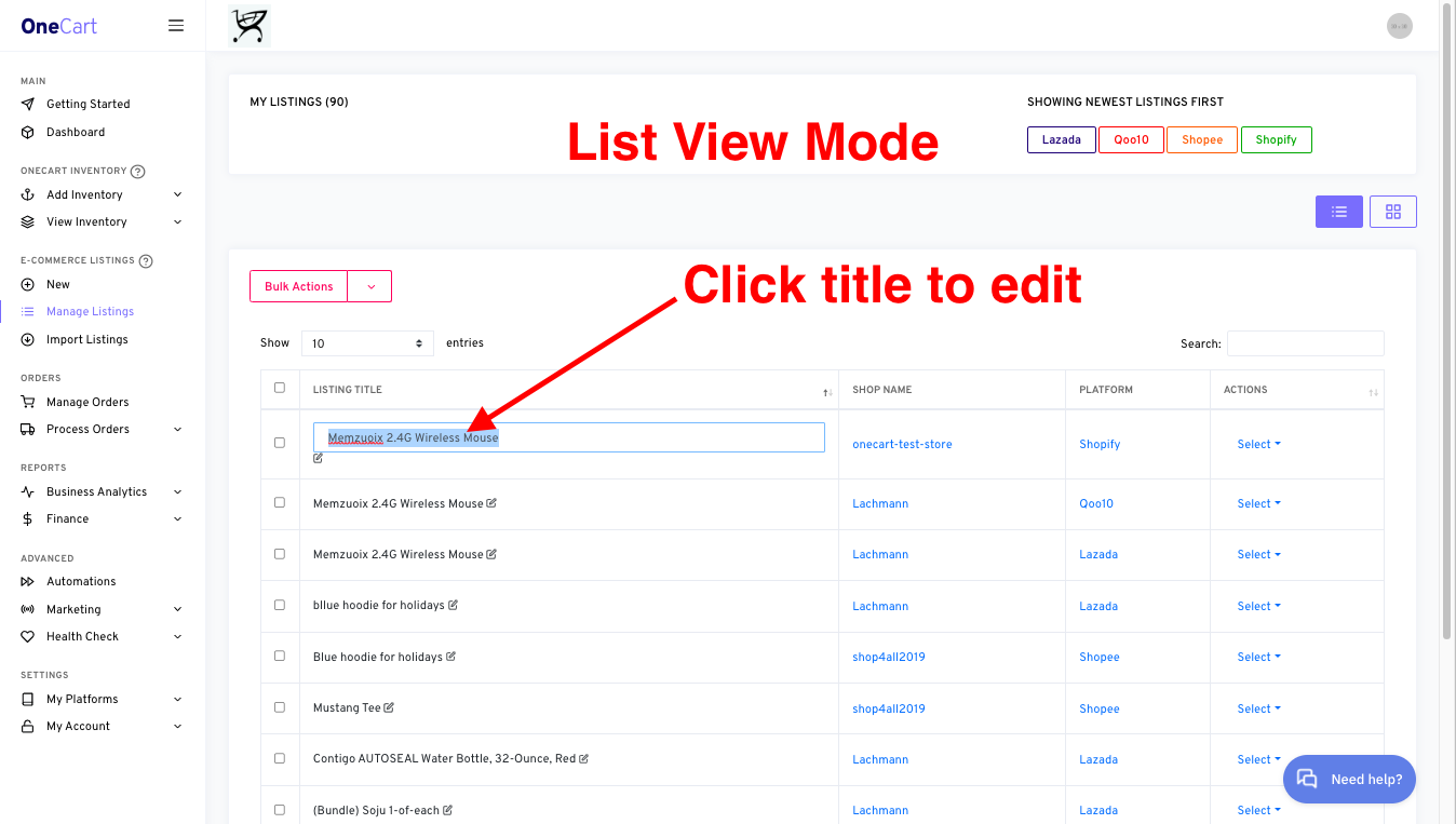 OneCart allows 2 options for editing listing titles: 1) from the OneCart listing page, 2) from the OneCart Listings List View page.
