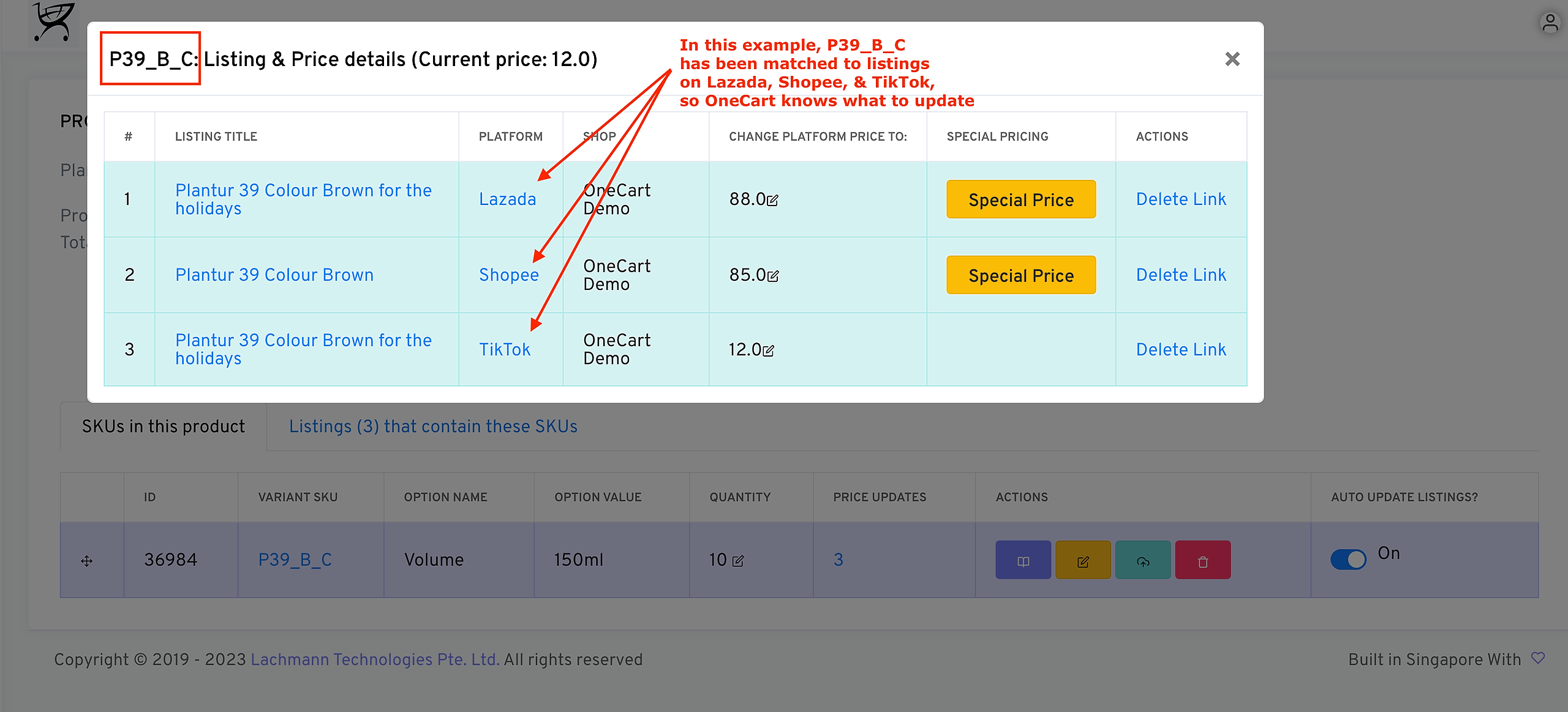 Matching your listings in OneCart tells the system which SKU is mapped to which listing on your e-commerce platforms. Once everything is matched, that means that all your active e-commerce listings on your different platforms are linked back to a SKU being managed in OneCart.