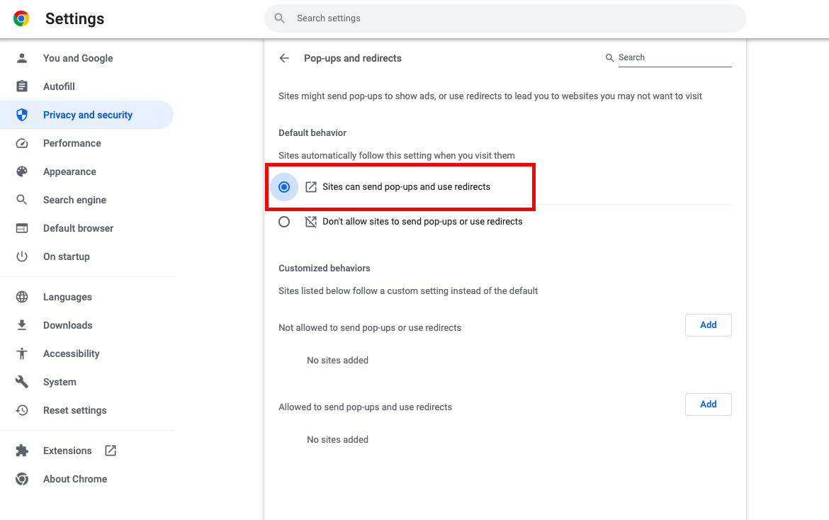 Select ‘Sites can send pop-ups and use redirects’