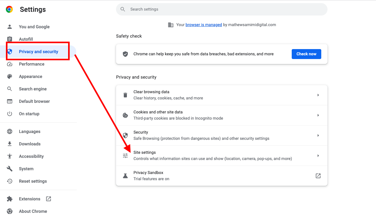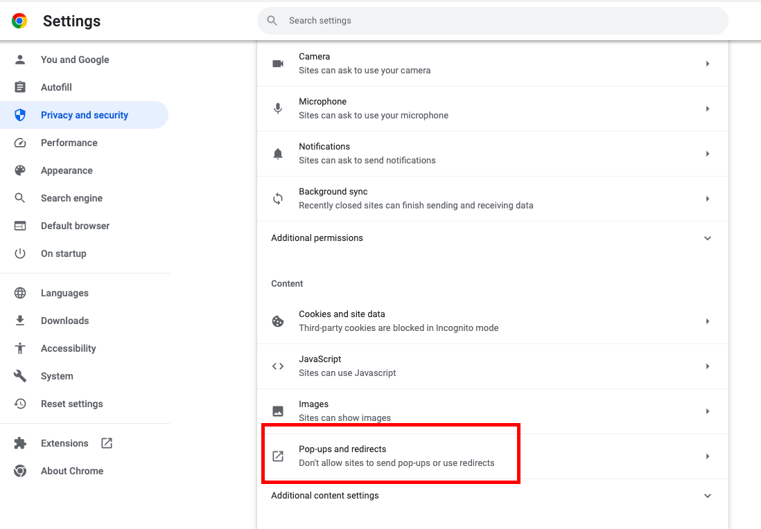 Under the section named ‘Content’, click on ‘Pop-ups and redirects’
