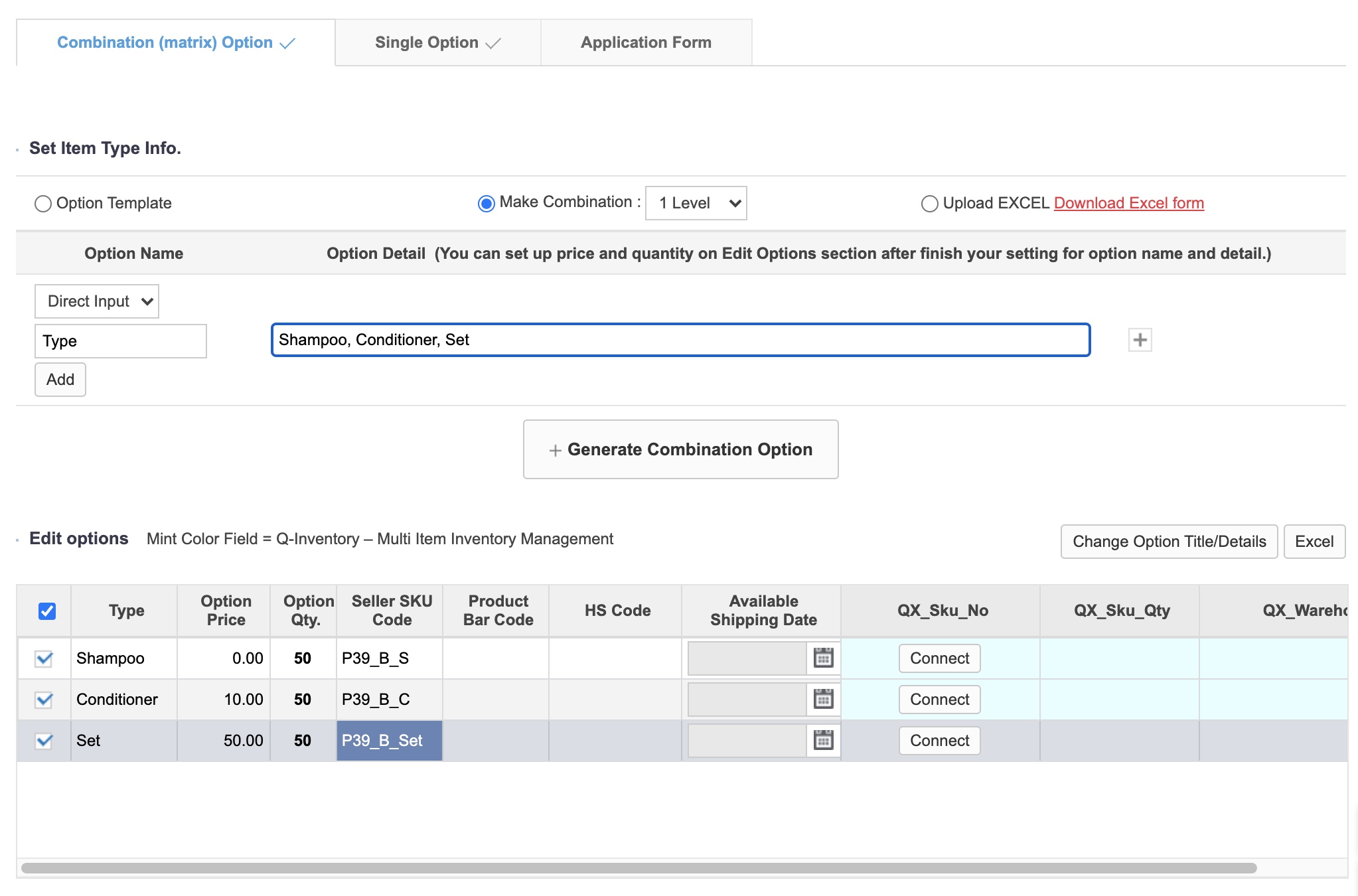Go to Combination (matrix) Option and key in the Seller SKU Code. Ensure that it is the same with OneCart. Option Price is the additional price on top of the sell price you have set prior.